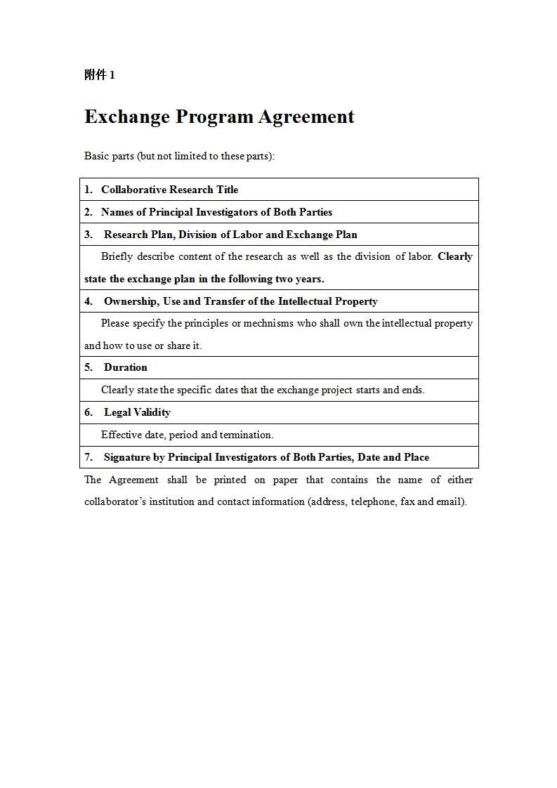 (1)申請合作交流項目,須提交合作協(xié)議(協(xié)議模板見附件1)。中外雙方申請人須就合作內(nèi)容、交流計劃及知識產(chǎn)權(quán)歸屬和分享的原則或機制等問題達成一致,并簽署合作交流協(xié)議。
