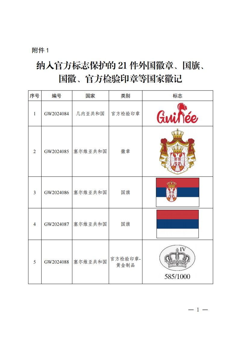 ? ? ?附件:1.納入官方標志保護的21件外國徽章、國旗、國徽、官方檢驗印章等國家徽記