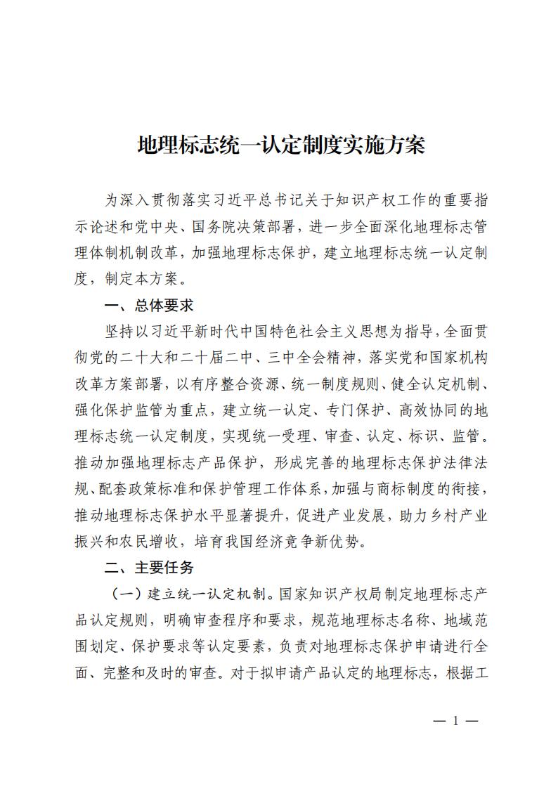 國家知識產權局等兩部門關于印發《地理標志統一認定制度實施方案》的通知